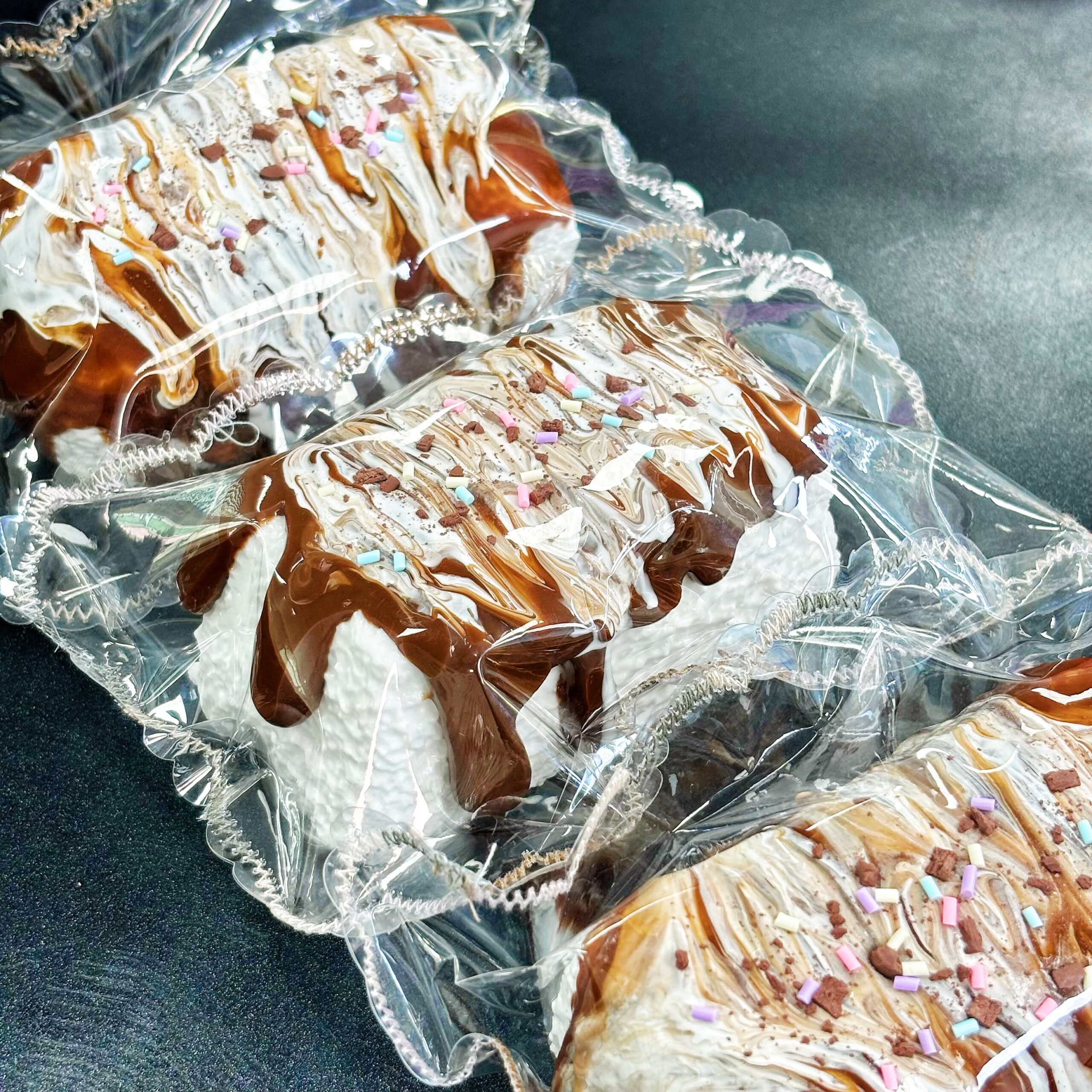 ふんわりとした白いスポンジ生地に、とろけるようなチョコレートとキャラメルのソースがかかり、カラフルなスプリンクルがアクセント。
