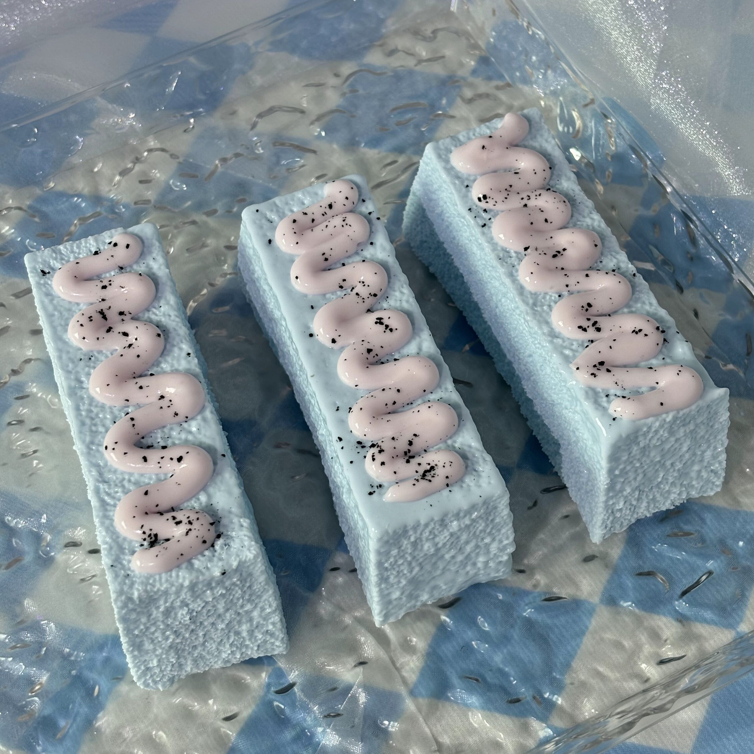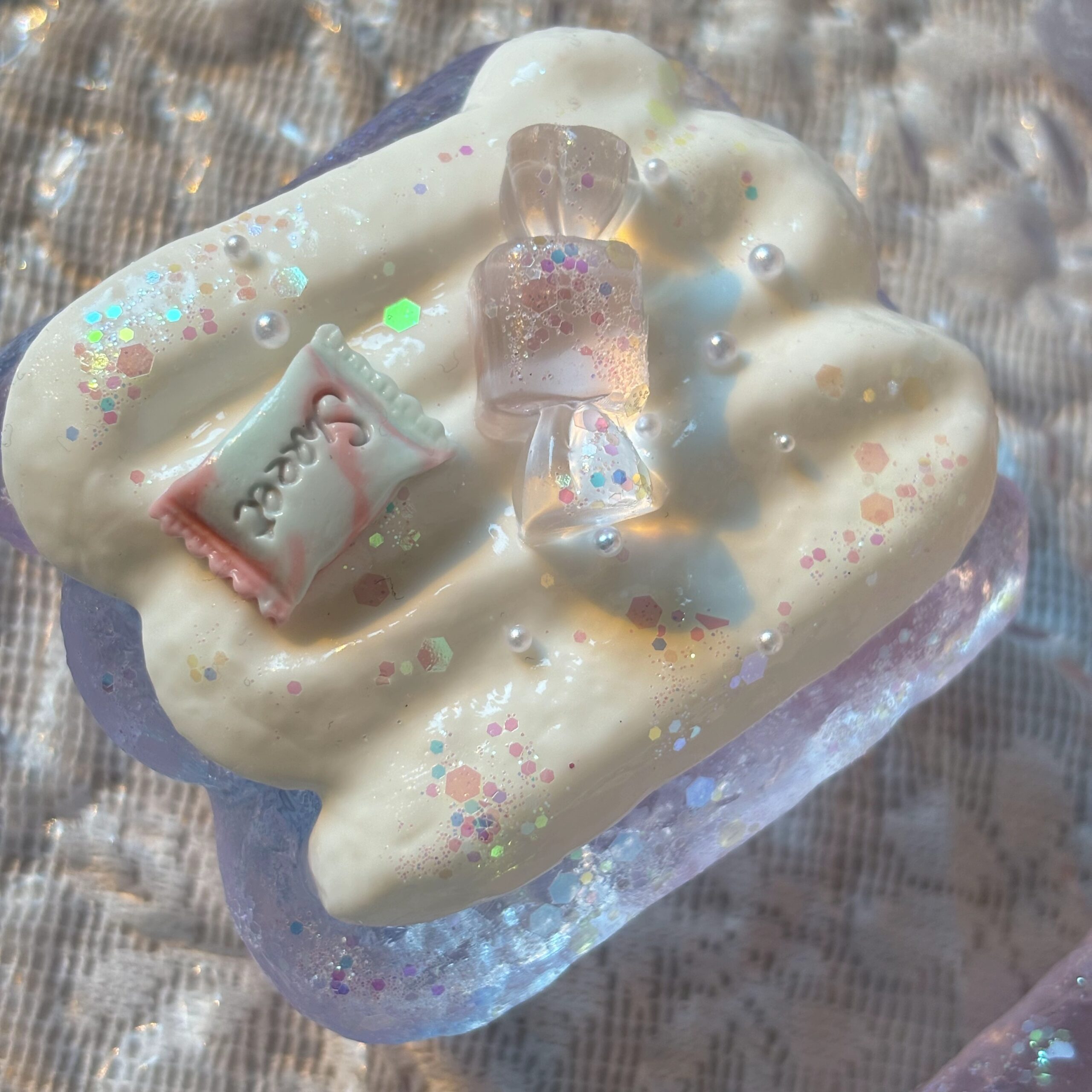 【掌サイズ 2 種類クリームスティック 願い込めスクイシー】おとぎ話のスイーツ棚から届いた 2 種類のふわふわクリームスティックです ——空色の款は青空を揉み込んだ桜クリームスワール,ふわふわシリコンは溶けかけた雲のよう,黒い粒は星のかけら。ピンクキャタピラー款はパン風に巻かれたシリコンにクマゼリーを包み,全身のキラキラはおとぎ話の甘さがこぼれたもの。