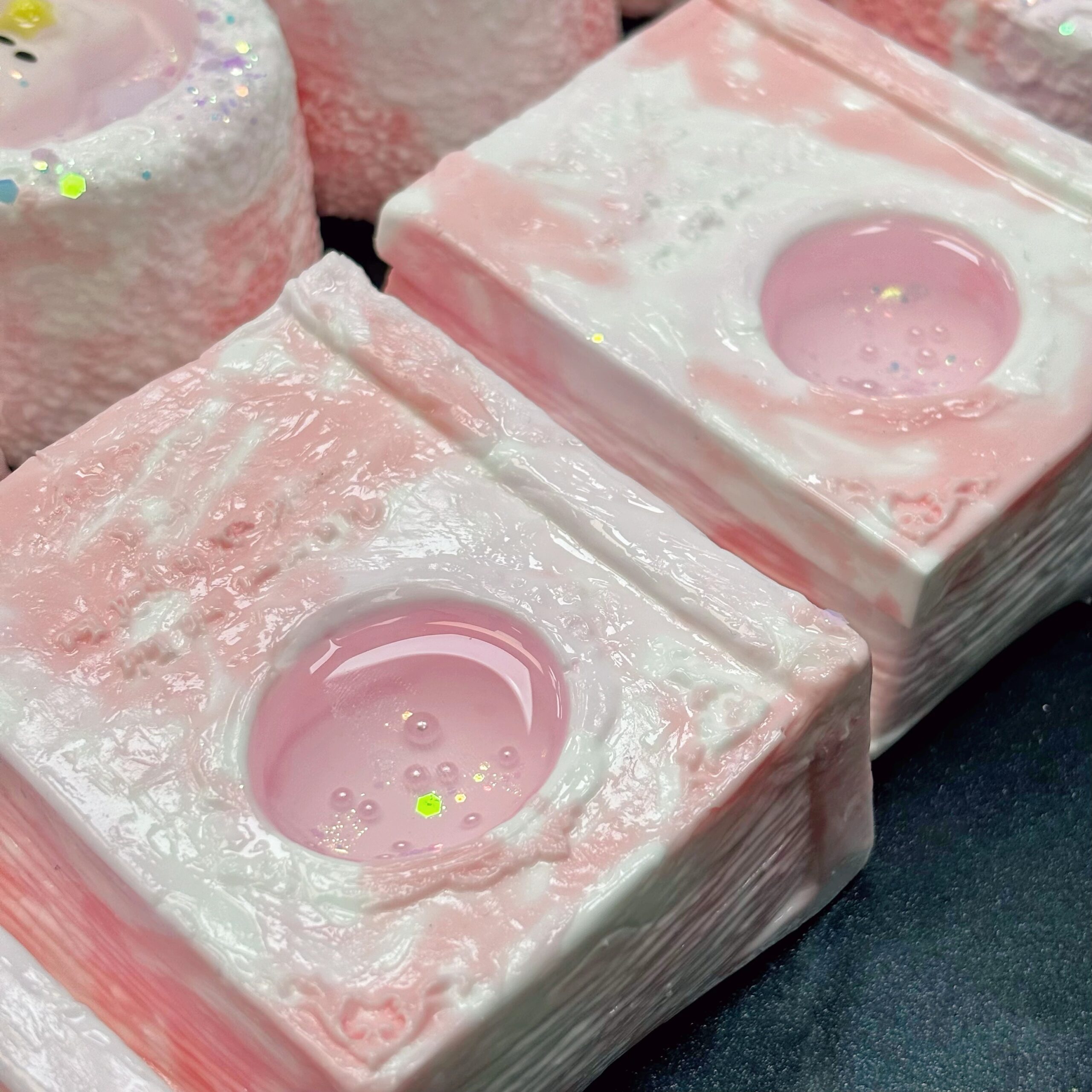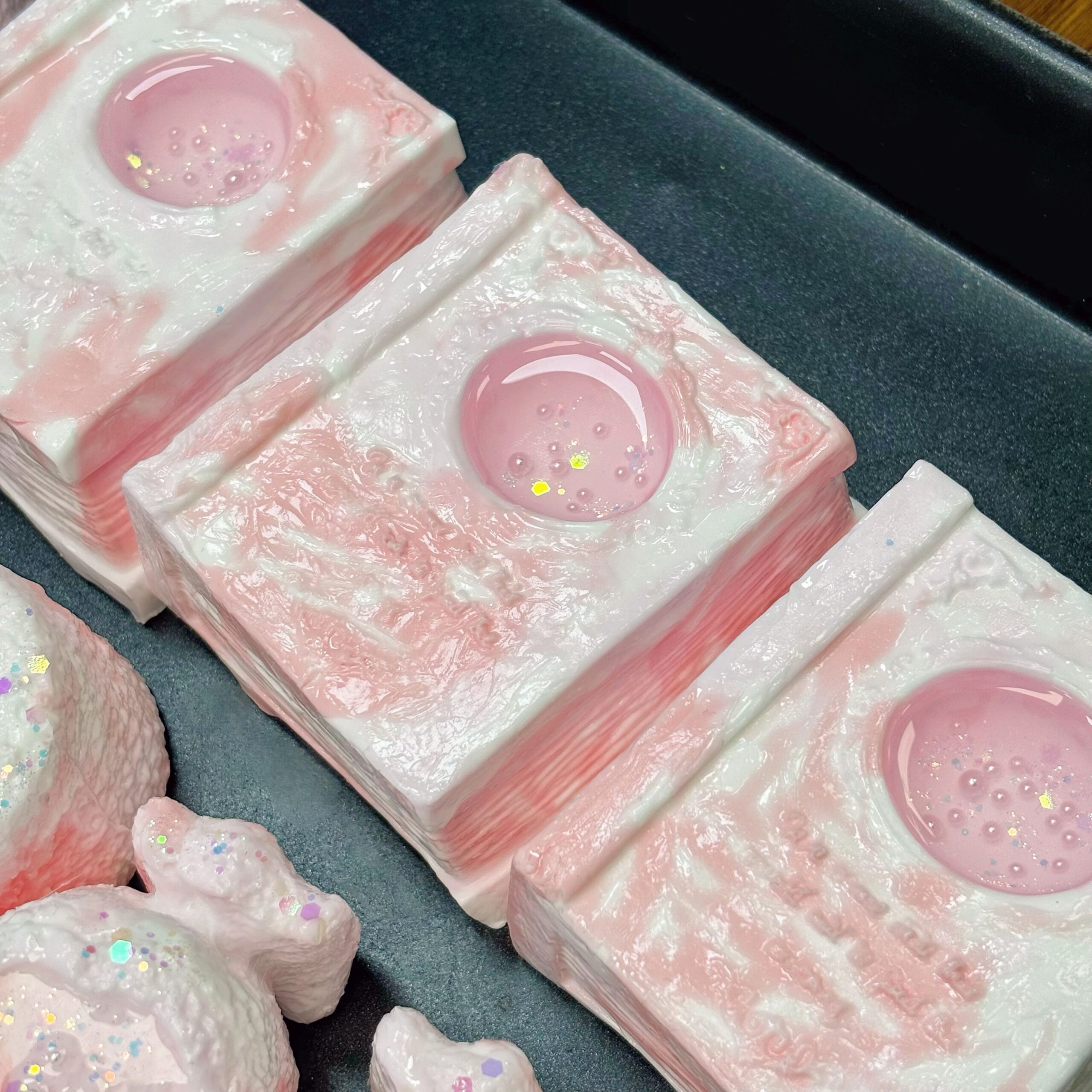 これはおとぎ話の森から届いたふわふわ木の株ケーキです —— 柔らかなシリコンの「年輪」に、桜のコケみたいなピンクの縁、全身にまぶされた星屑キラキラは森の精が撒いた願いの粉なのです。ポケットに入る秘密の木の穴:DIY する瞬間は、口に出せない優しい思いをこのふわふわに包み込むよう;指でそっとつまむと、ほんわかと凹んでまたゆっくり弾け返り、まるで森があなたの思いをそっと抱きしめてくれるような癒しの触感。手元に置いておけば、日常の疲れもこの森の甘さで溶けていきます。