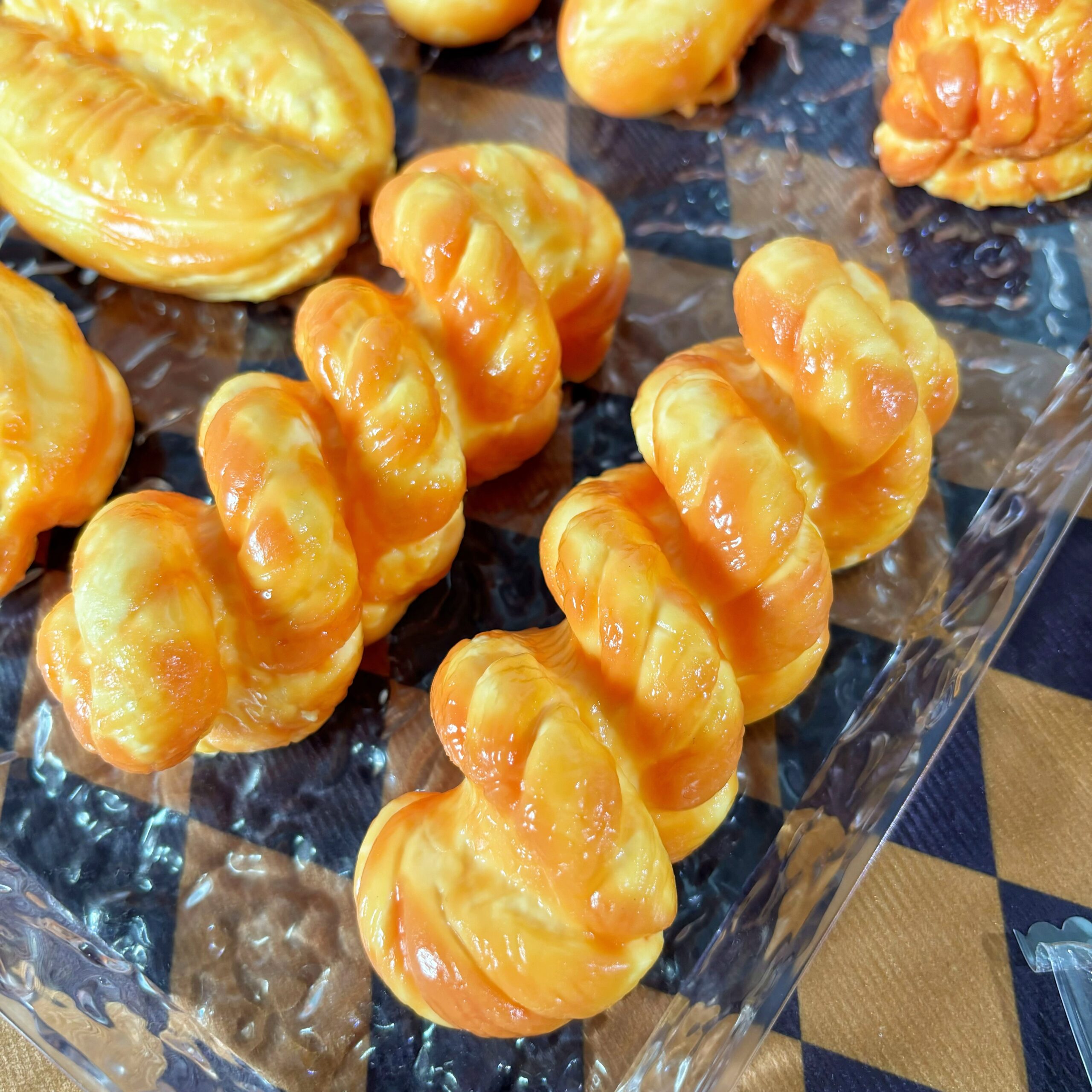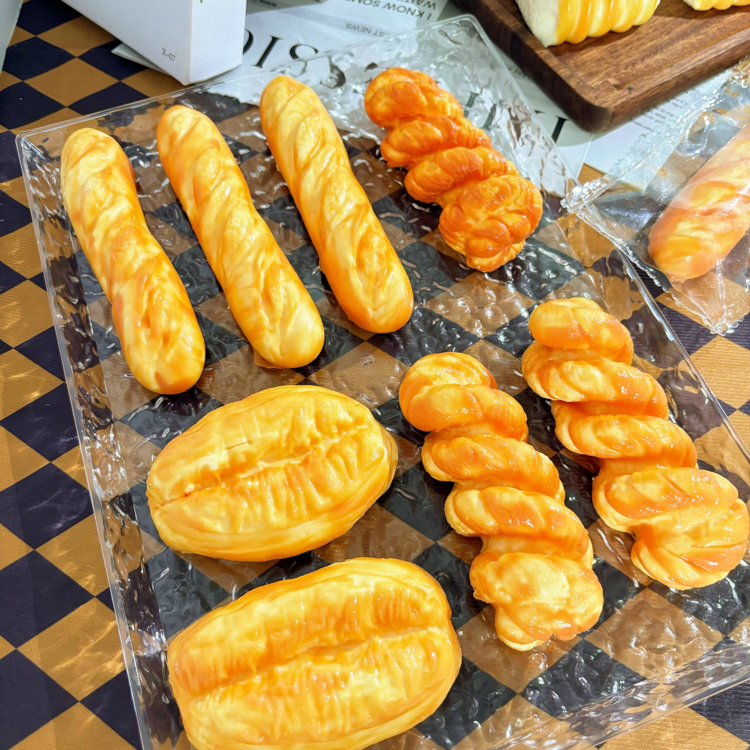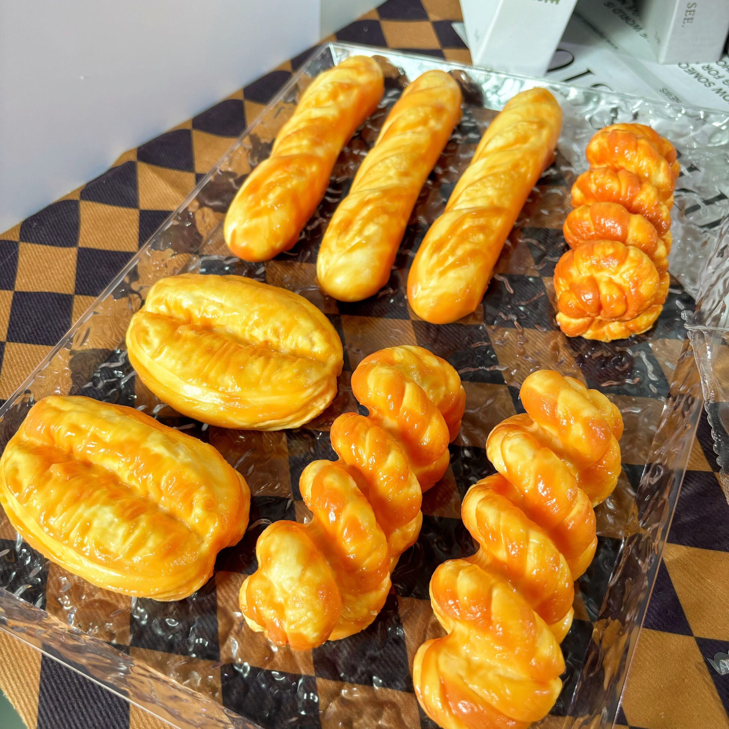 パン屋さんの定番 4 種類の「本来の質感」を再現:バゲットの麦の皺、ツイストパン(麻花)のねじれた肌理、キャタピラーパンの柔らかな模様、ふっくらパンの丸いカーブ —— どのディテールも、焼きたての本物パンそっくりです~